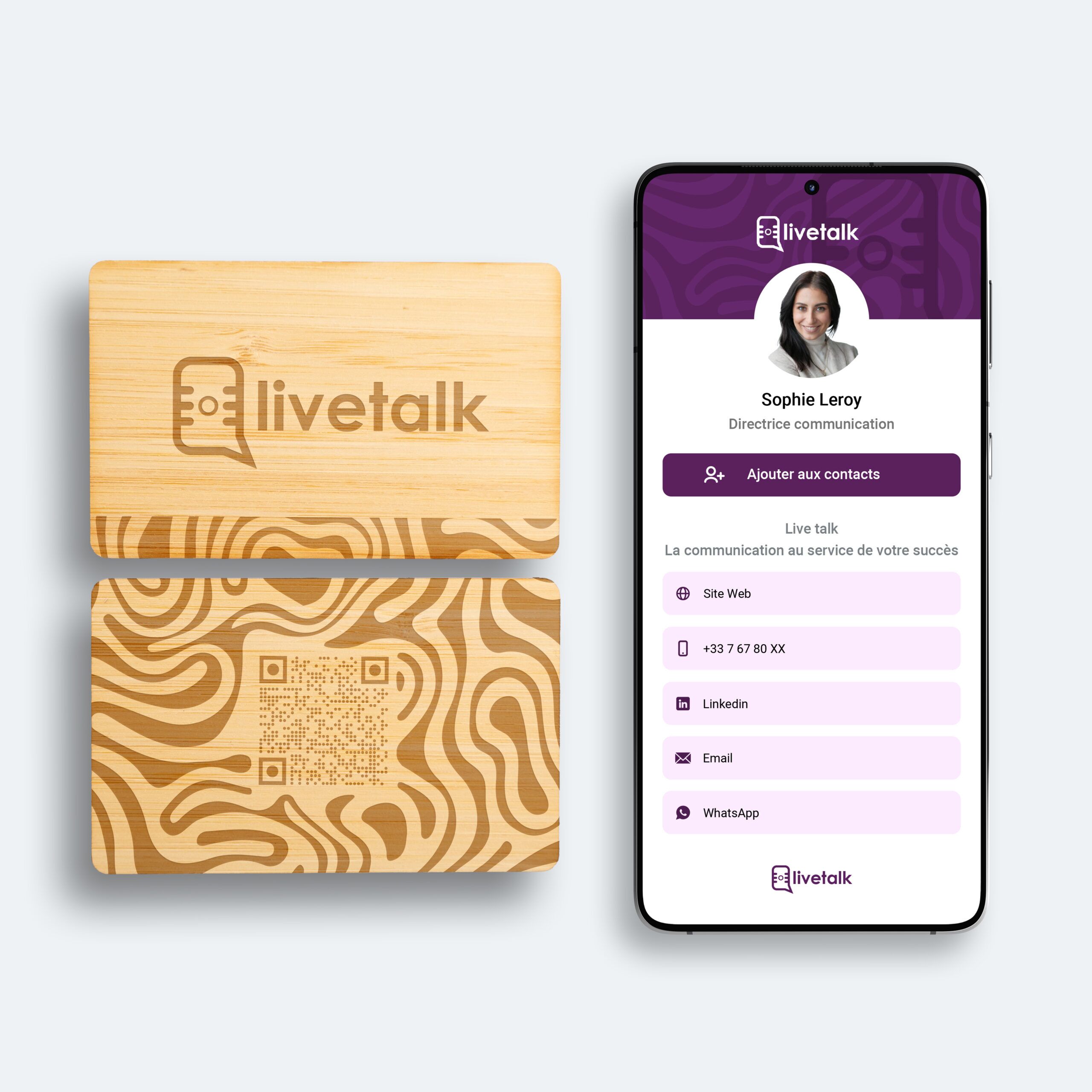 Chaque carte en bois est unique : les variations naturelles de couleur et de veinage garantissent que personne n’aura exactement la même. Associée à la technologie NFC intégrée, elle allie tradition artisanale et innovation moderne, offrant un objet à la fois pratique, durable et mémorable.