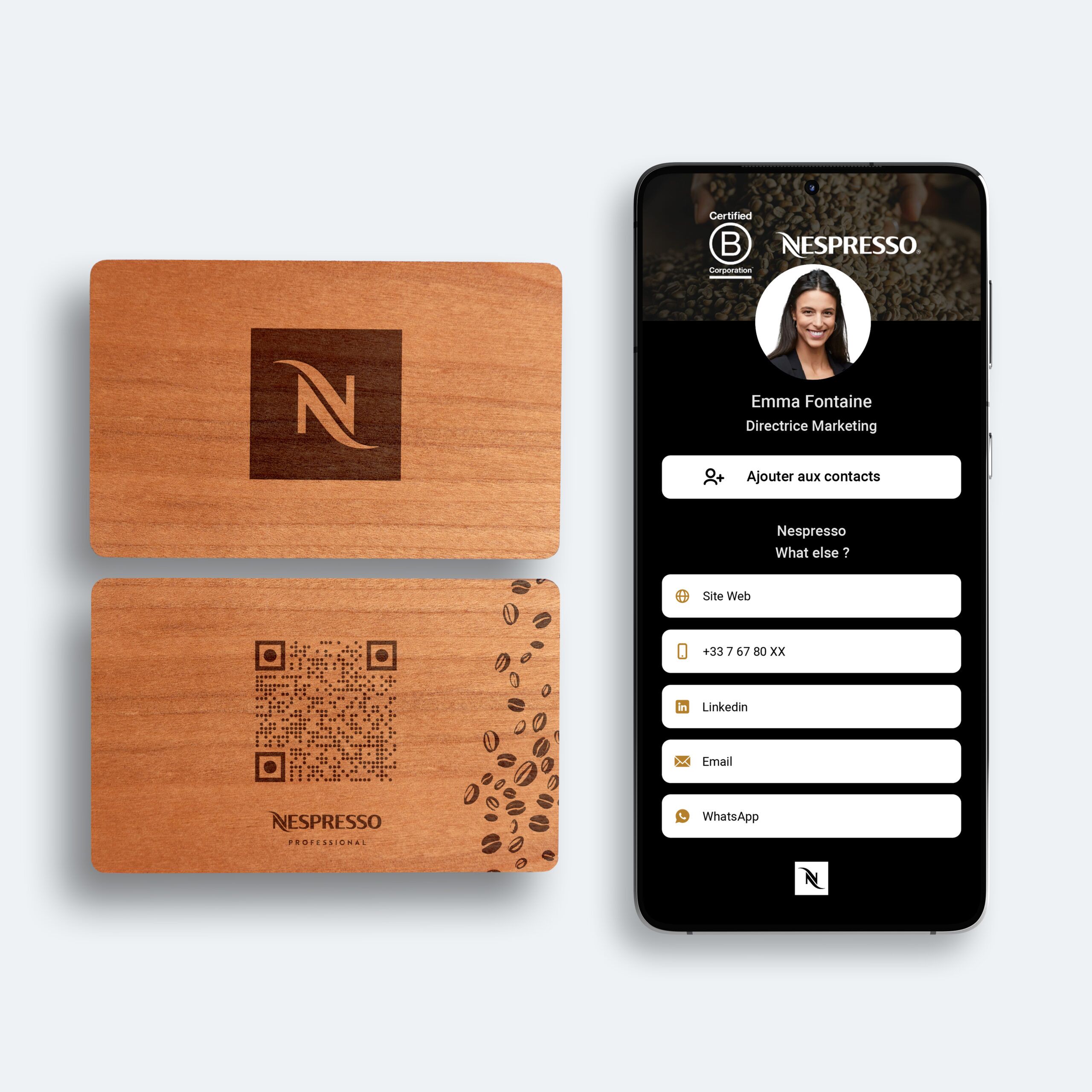 Chaque carte en bois est unique : les variations naturelles de couleur et de veinage garantissent que personne n’aura exactement la même. Associée à la technologie NFC intégrée, elle allie tradition artisanale et innovation moderne, offrant un objet à la fois pratique, durable et mémorable.